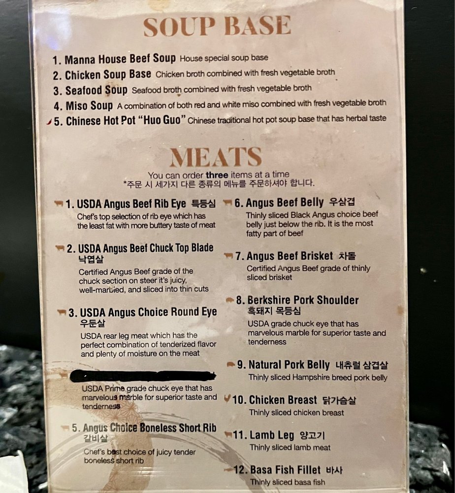 What sets Manna apart is the interactive grilling experience, allowing you to customize your meal with various soup bases, fresh veggies, and tantalizing sauces. Customers rave about the attentive service, noting that staff like Young Ju enhance the dining experience with their friendliness and efficiency. While there may be a few misses in the banchan department, the focus here remains firmly on the fresh and delicious offerings that keep guests returning.